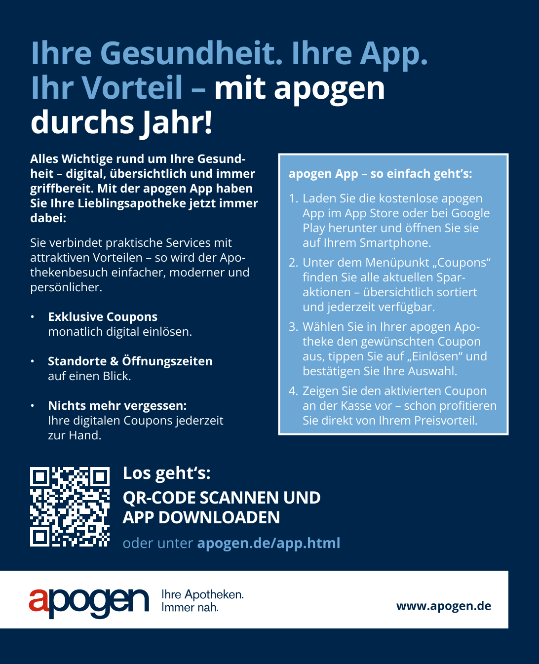 Gerade in der Gesundheitsberatung ist ein ansprechbarer Dienstleister „um die Ecke“ ein Vorteil, der die apogen Apotheken klar von der sich im Internet entwickelnden Konkurrenz abhebt. Nicht zuletzt können wir die Vorteile, die aus einer starken Gemeinschaft erwachsen, auch direkt an unsere Kunden weitergeben. Das zahlt sich für alle aus!